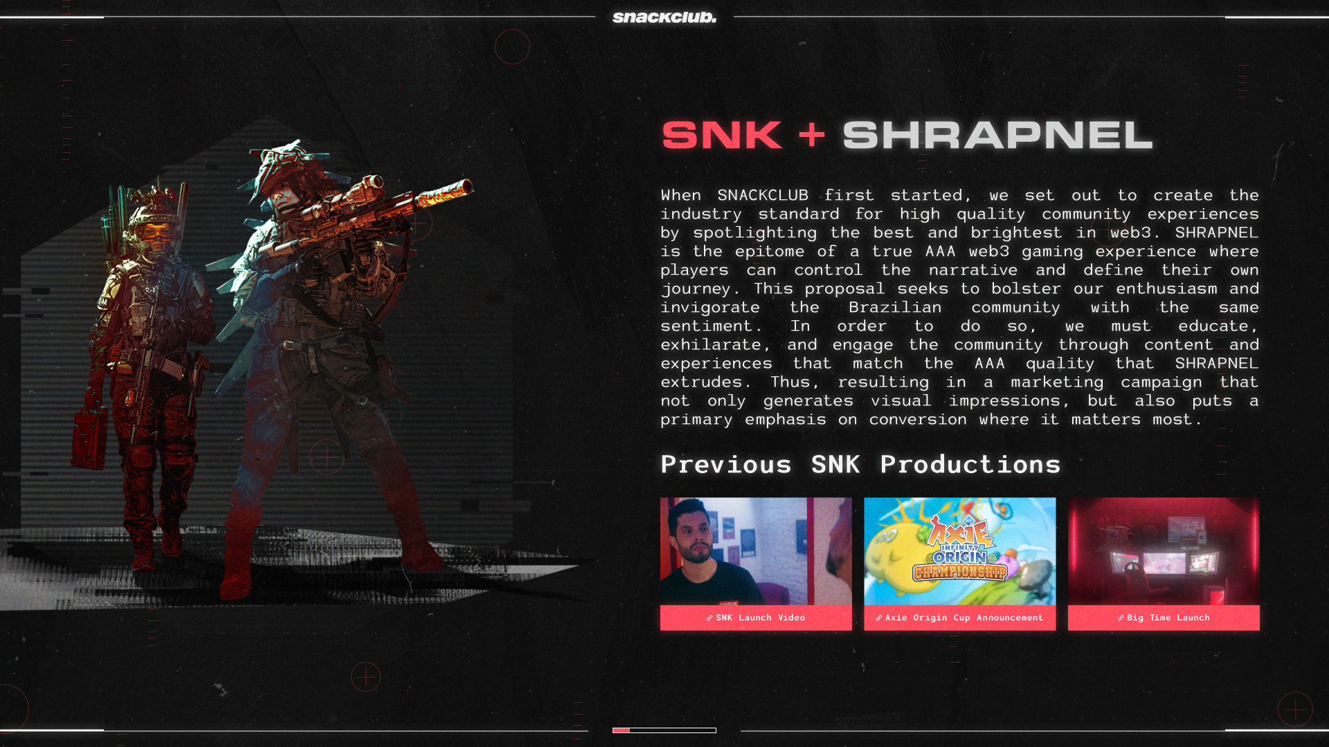 O Shrapnel é um jogo eletrônico de estratégia militar online, que tem como objetivo oferecer uma experiência única aos seus jogadores. A SNACK, em parceria com a Shrapnel, produziu uma campanha que sorteou um computador gamer de R$15.000 para a comunidade de jogadores. Para isso, foram criados assets gráficos com o objetivo de comunicar de forma clara e impactante a promoção. Com isso, a SNACK conseguiu atrair a atenção do público-alvo e aumentar as chances de sucesso da campanha.